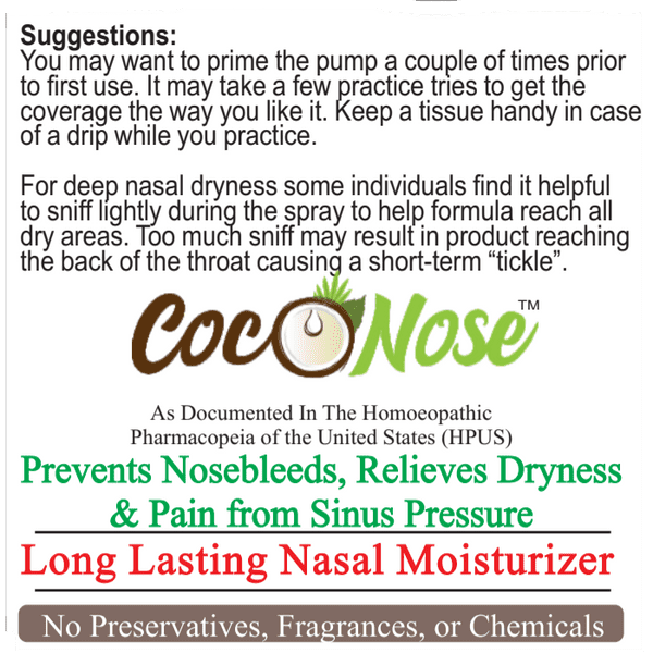 CocoNose™, the long-lasting nasal moisturizer that soothes the discomfort experienced with dry and irritated nasal passages caused by dry air and pollutants. With just 1 or 2 applications a day, CocoNose™ prevents nasal dryness and associated nosebleeds with ingredients documented to moisturize the nasal cavities and prevent nosebleeds. Free Standard Shipping. *To mitigate the chance of the spreading infection, we do not accept returns for personal care products which includes CocoNose. For questions or concerns, please contact us at: info@cococorp.us. Thank you.